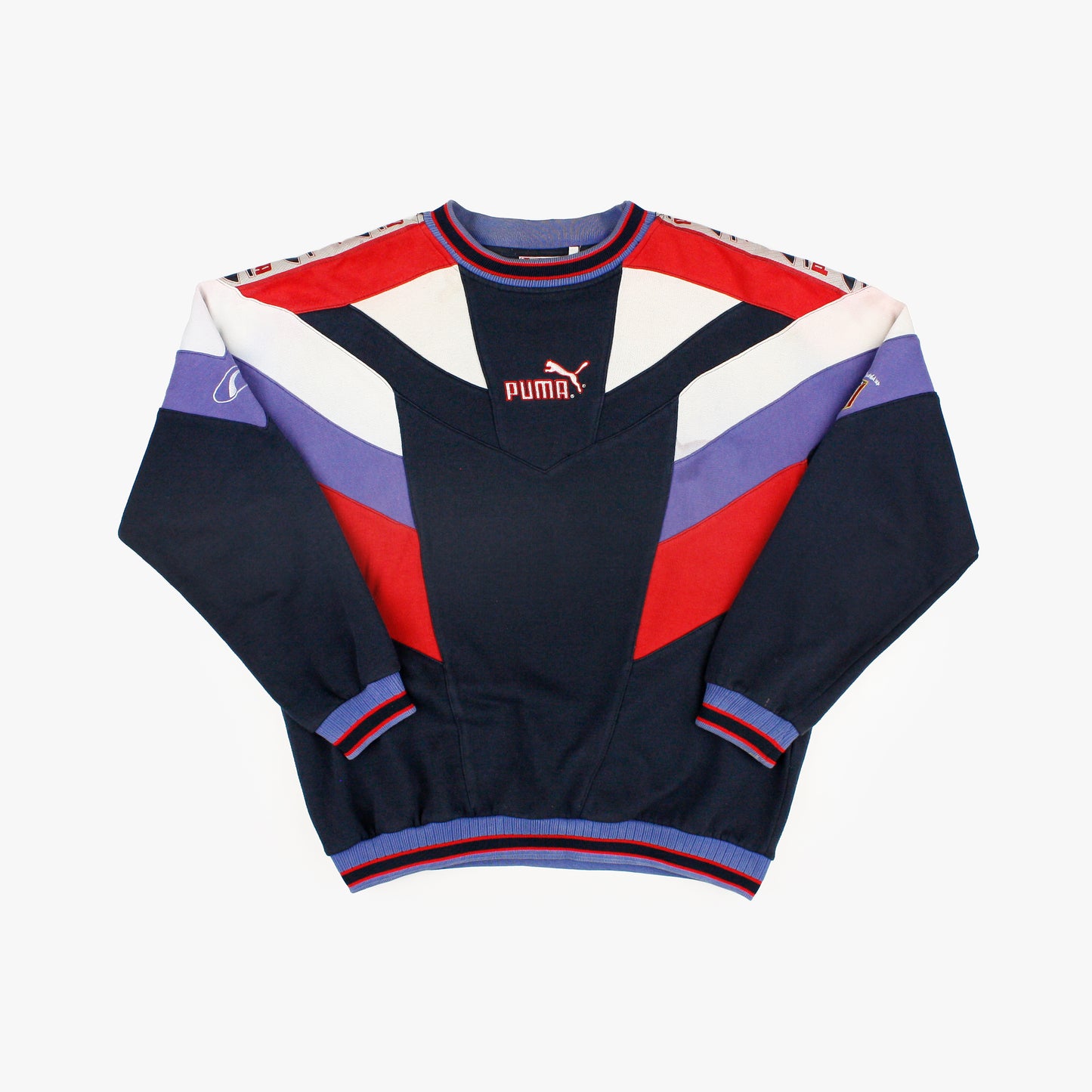 Condition: 7/10 (the sweatshirt in general is in good vintage condition, there's a notable stain on the right side of the lower back, and *there's some blue & red colour run on the white section of the sleeves* not visible in the photos)