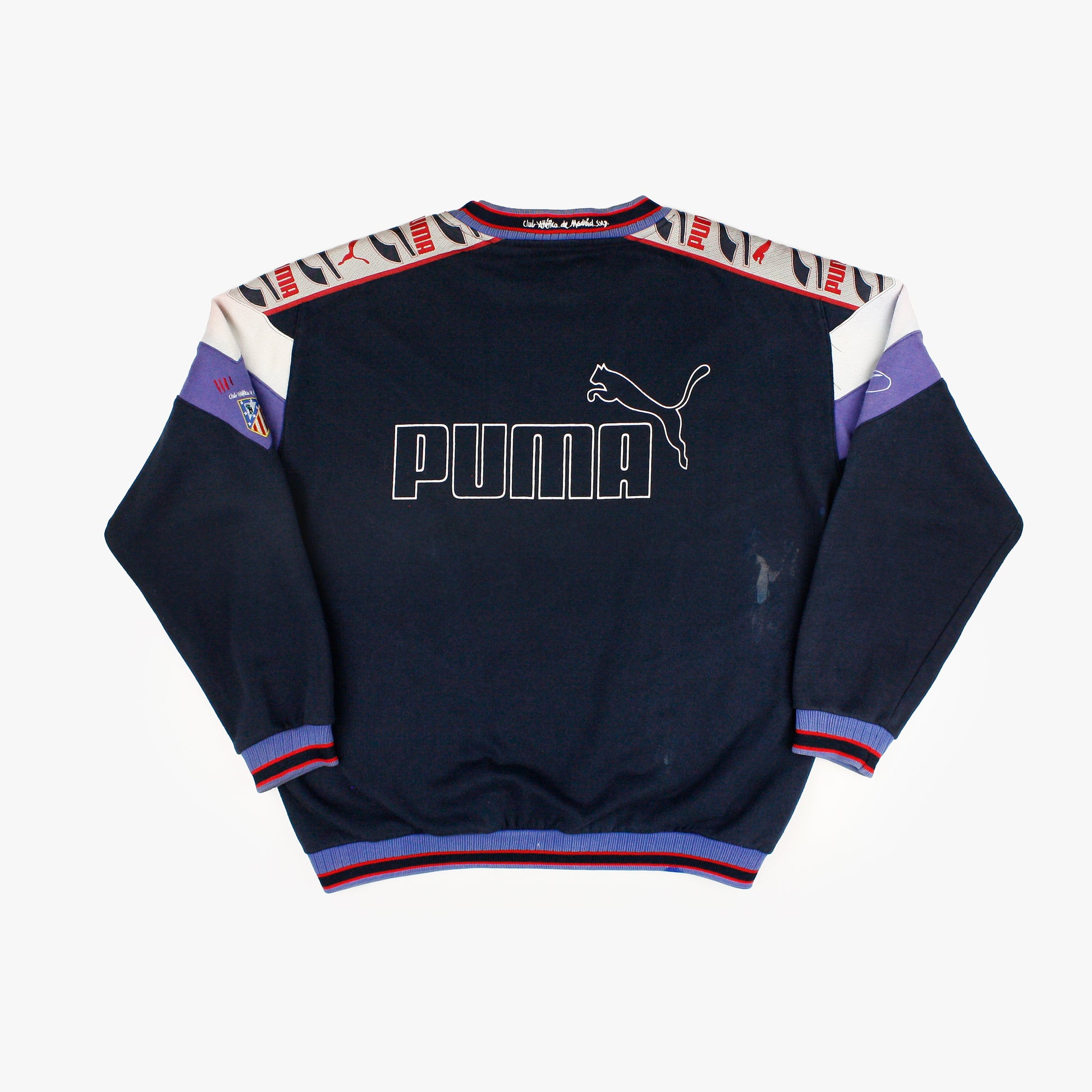 A vintage Puma sweatshirt of Atlético de Madrid in blue, white, and red, featuring an embroidered logo on the chest and a badge on the sleeve.