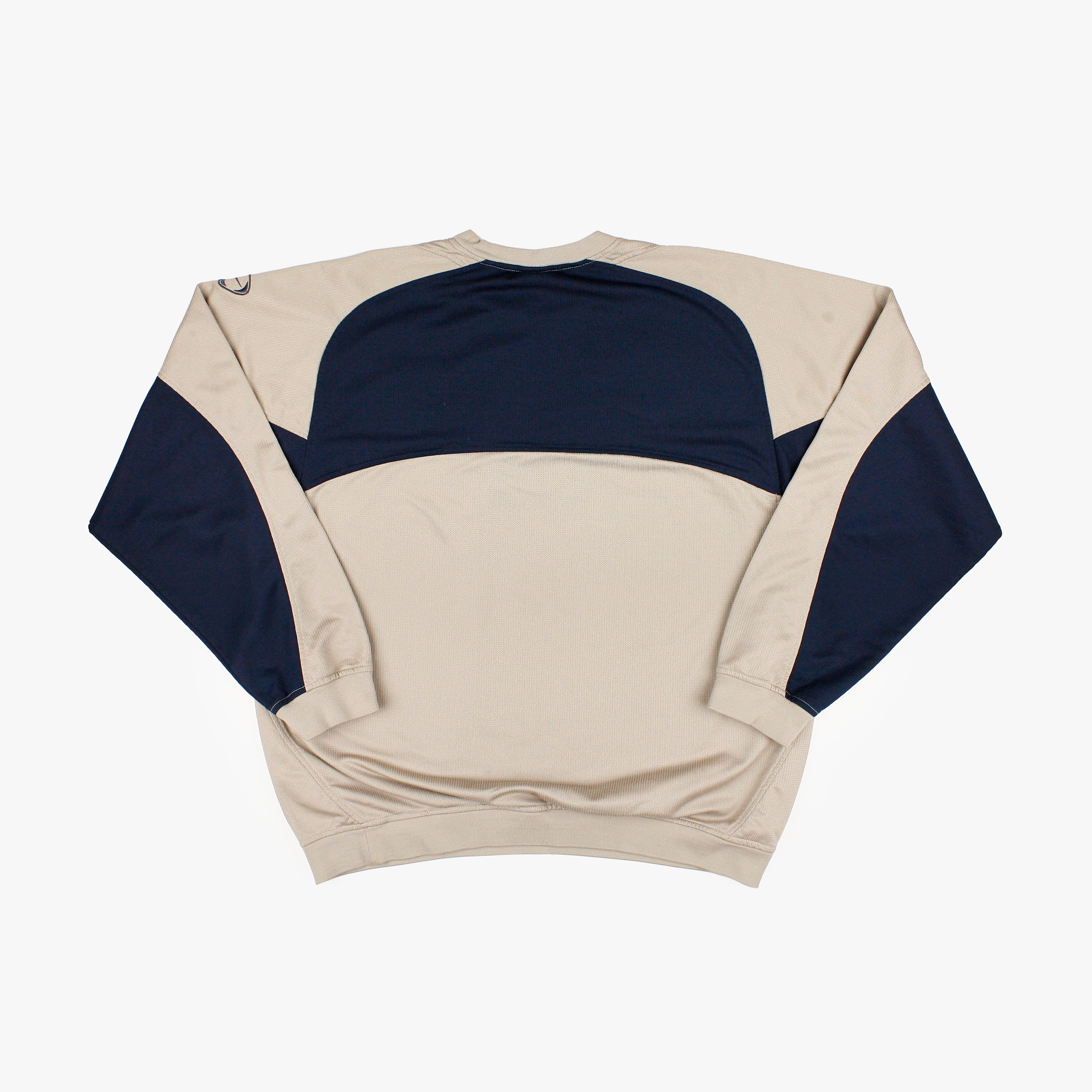 This official Nike sweatshirt comes from the 03/04 season, a year that marked the beginning of a new era for FC Barcelona. With Frank Rijkaard on the bench and Ronaldinho newly signed from PSG, the club began a turnaround that would eventually return them to the top of European football. Barça finished second in La Liga, closing the season with a remarkable run of results. The sweatshirt features the classic early-2000s Nike training design, with embroidered crest and swoosh, and a clean navy and cream palette — a staple from a season that laid the groundwork for future success.