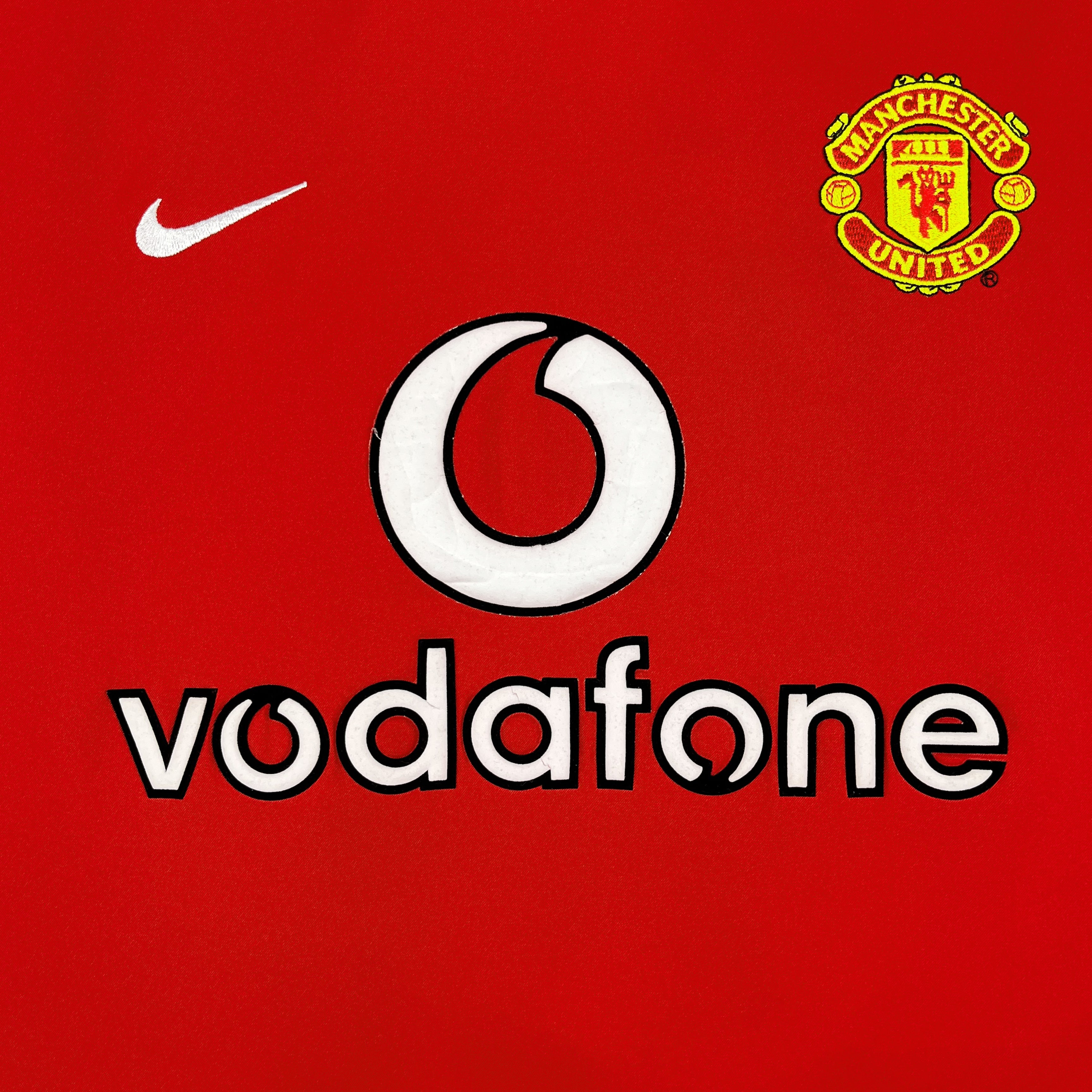 This Nike home shirt, featuring the official Scholes #18 nameset, was worn during the 02/03 and 03/04 seasons — a key period in Paul Scholes’ prime. In 02/03, Scholes played a crucial role in helping United win the Premier League title, contributing 14 league goals and his trademark late runs into the box. The following season saw United lift the FA Cup, with Scholes ever-present in midfield. The shirt marks Nike’s first design for the club, with a clean red body, curved black side panels, and the classic Vodafone sponsor — now closely associated with United’s early-2000s dominance.