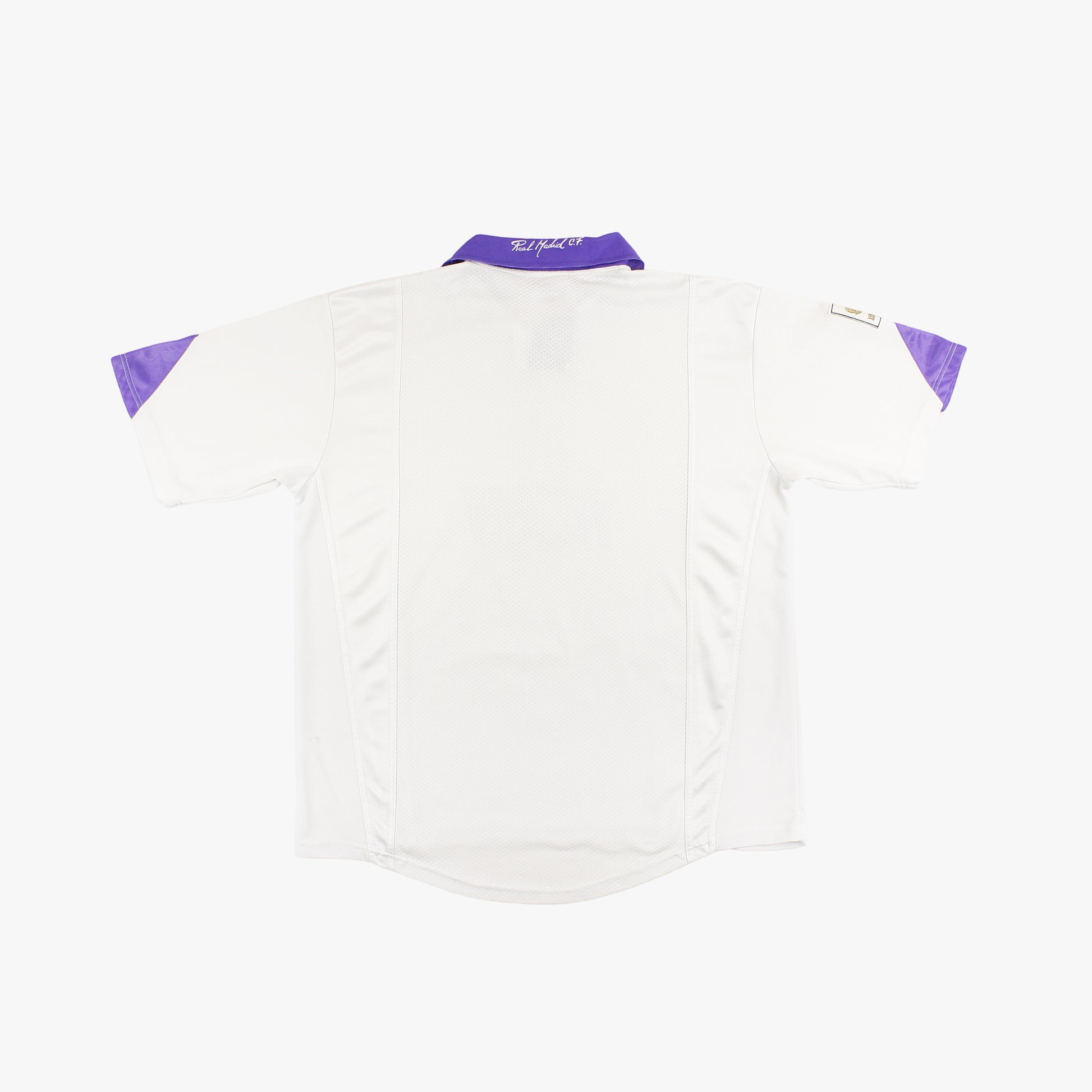 97/98 is a season defined by contrast: Madrid finished 4th in La Liga, but made up for it by winning the Champions League (La Séptima), ending a long wait with a landmark final victory over Juventus in Amsterdam. The home shirt is a true Kelme-era classic — crisp white with purple accents and the Teka sponsor, instantly recognisable to anyone who grew up on late-90s football. Design-wise, it’s all in the finishing: purple trim lifts the collar and cuffs, while the repeated Kelme paw-print detailing adds subtle texture without distracting from the clean all-white look.