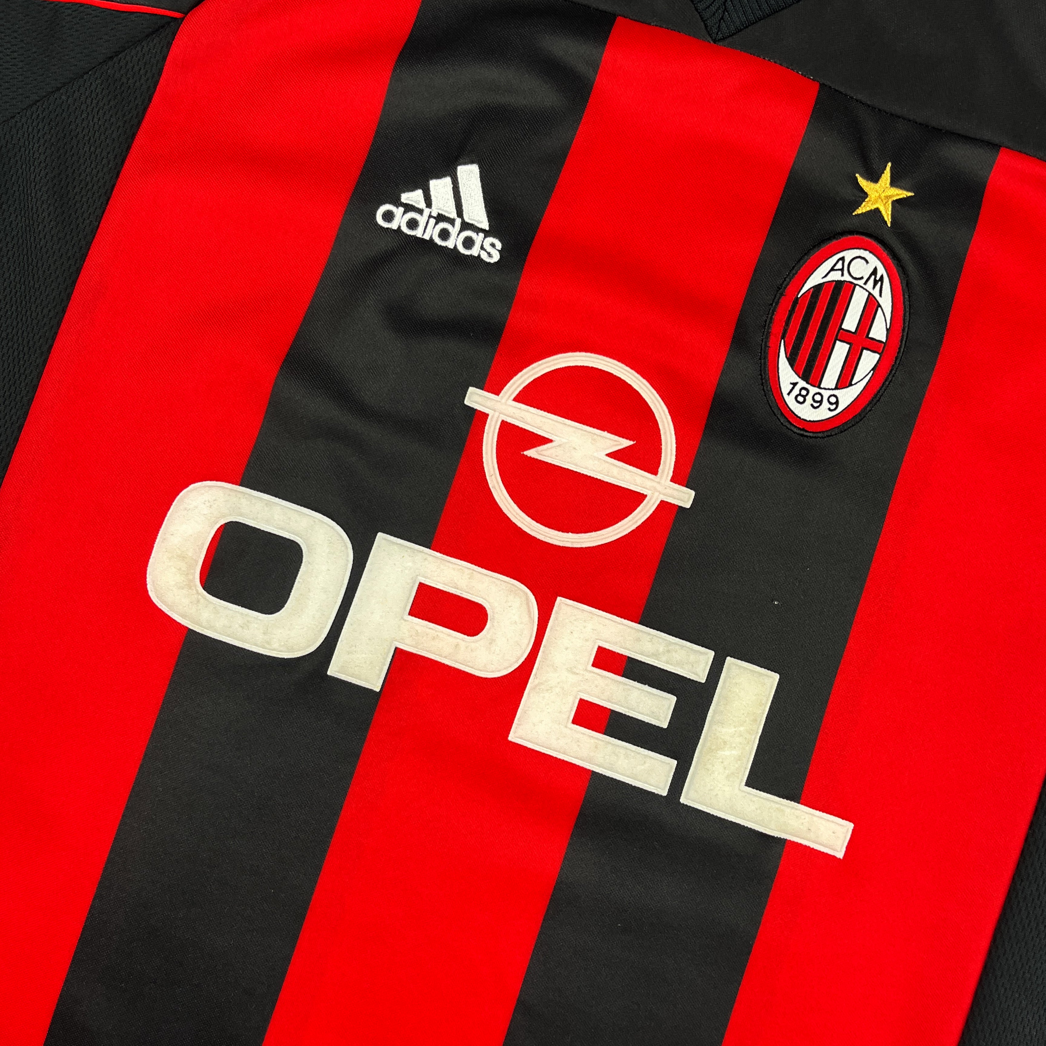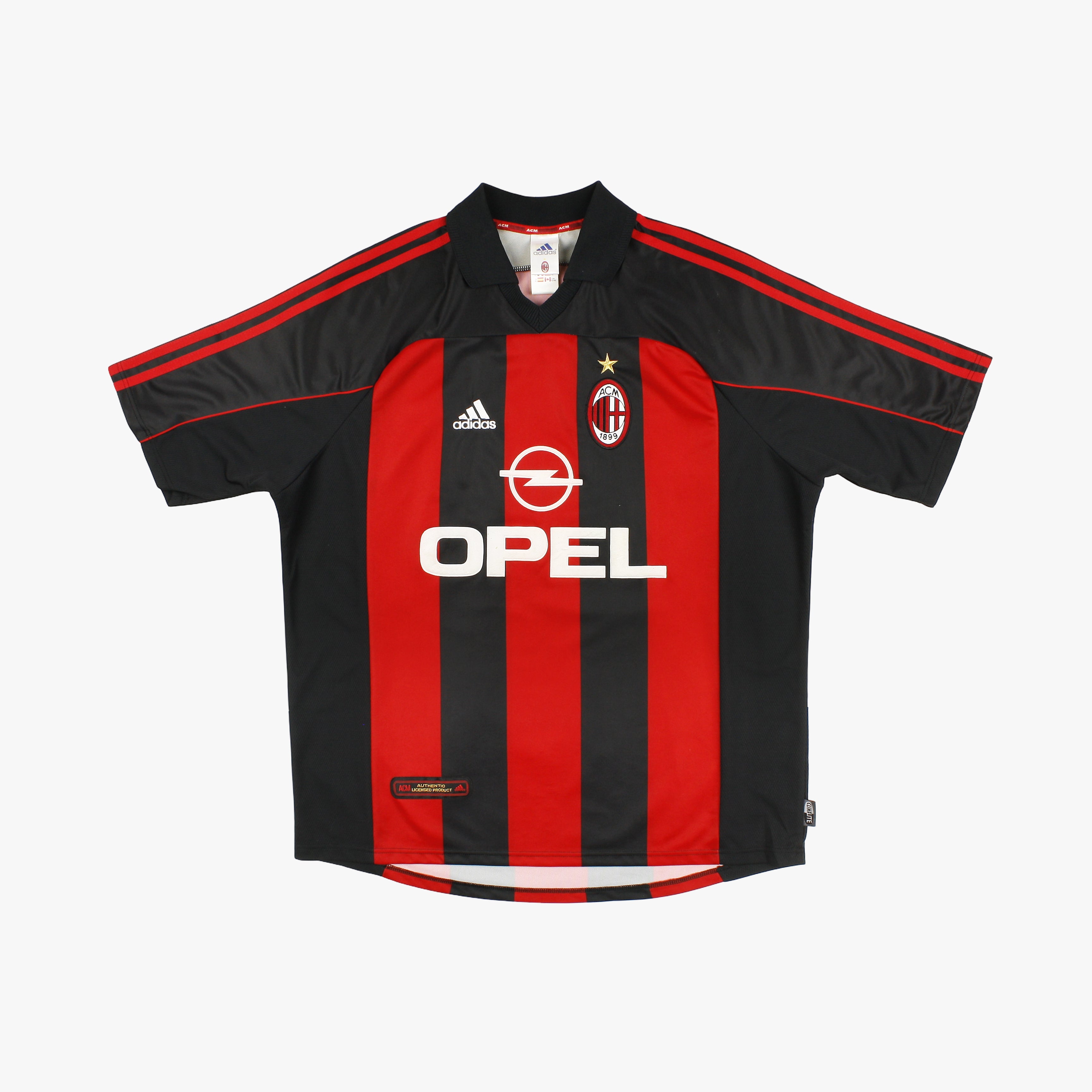 Esta camiseta local de Adidas se utilizó entre las temporadas 2000/01 y 2001/02, en una etapa de transición para el Milan bajo Cesare Maldini, Fatih Terim y posteriormente Carlo Ancelotti. Aunque el club terminó en media tabla en 00/01, el equipo empezó a reconstruirse en torno al liderazgo de Paolo Maldini y a los goles de Andriy Shevchenko, que anotó más de 30 en aquella campaña. El diseño presenta las clásicas franjas rojas y negras, el patrocinador Opel y las tres bandas de Adidas en las mangas — una versión limpia y elegante que marcó el inicio de una nueva era en San Siro.