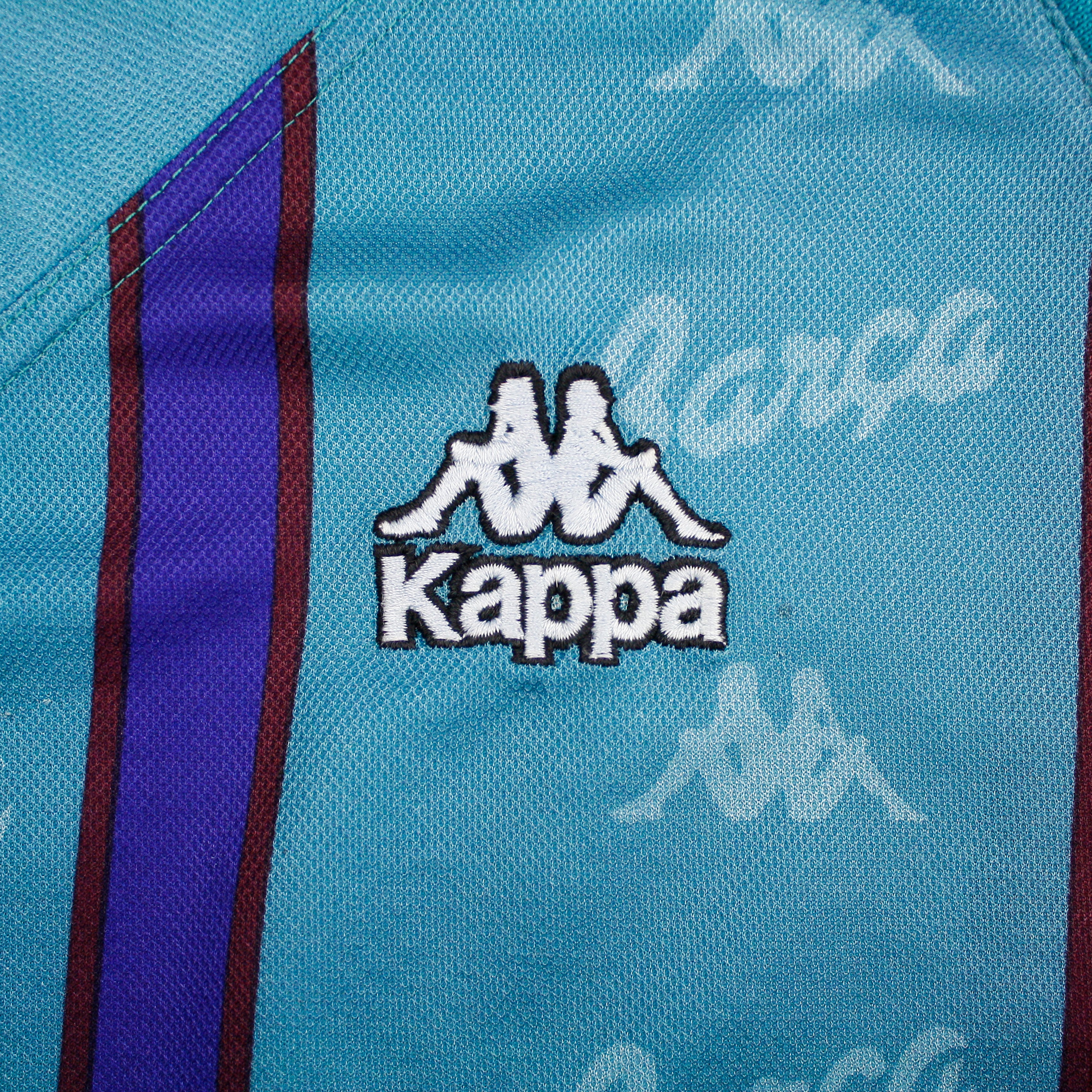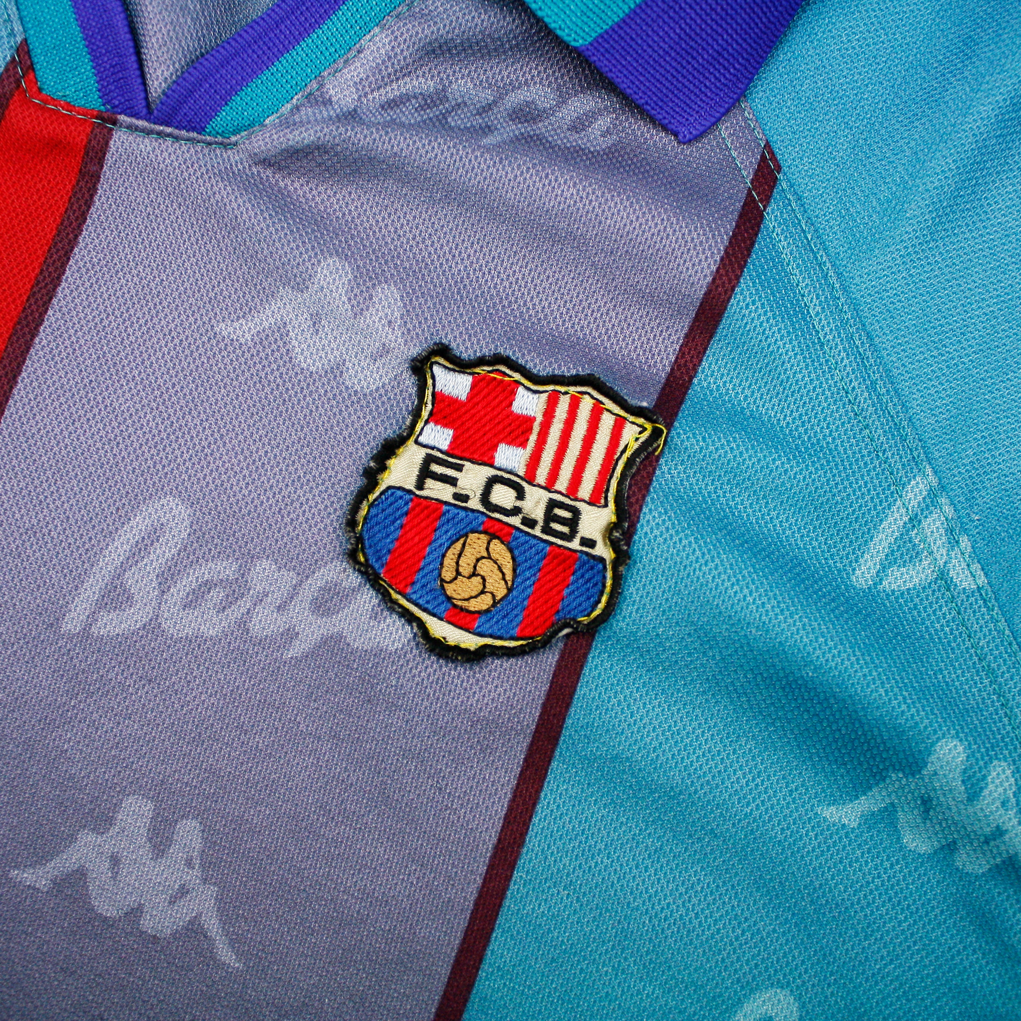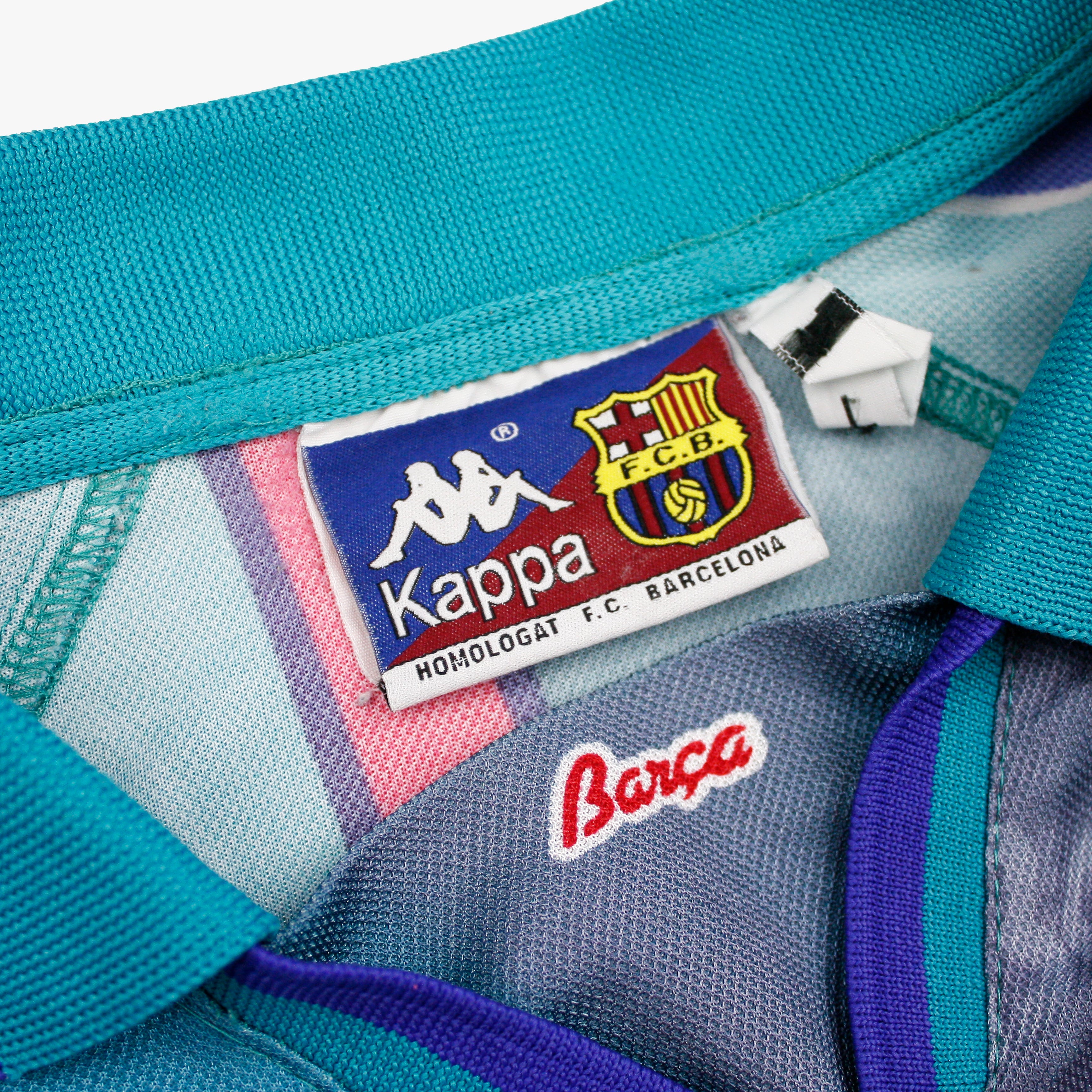 Esta camiseta icónica del Barcelona, diseñada por Kappa, la llevó en su única temporada como azulgrana el legendario Ronaldo Nazario. Con Bobby Robson como entrenador, (el noveno mánager Inglés del club) el Barça ganó la Copa del Rey y la Recopa de Europa de la UEFA, y El Fenómeno marcó 47 goles por el camino. Pero al final de la temporada el Real Madrid ganó La Liga por un pelo, con solo 2 puntos entre ambos equipos en la clasificación final.